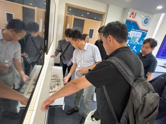 随后,飞龙教授邀请奥干巴特尔所长一行参观了中心展厅,并介绍了关于蒙古文智能信息化、蒙古文古籍文献保护等方面开展的相关工作及成果。