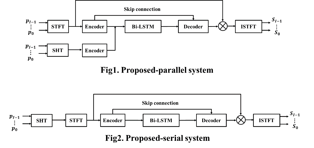 将球谐变换系数作为模型的辅助输入可以简洁地表达空间分布,允许不同麦克风数量的信号转换为统一维度的系数,使得单一模型能够适应不同配置的麦克风阵列,无需为每种布局单独设计模型。团队设计了两种基于SHT辅助输入的模型架构:并行与串行。并行模型包括两个编码器,分别处理STFT和SHT数据,通过合并这两个编码器在解码器中的输出来估算增强的STFT,有效地融合了空间上下文信息。串行模型则首先对信号应用SHT变换,再将转换后的信号的STFT作为网络输入。这项研究的主要贡献包括:首先,将球谐变换技术集成进深度学习方法中,改进了多通道语音增强的空间处理能力;其次,引入了两种创新的网络架构,分别独立处理STFT系数和SHT的并行模型,以及联合处理空间和频谱数据的串行模型;最后,证明了所提模型在多种环境条件下均能展现出卓越的性能,并且能有效适应不同的麦克风阵列配置。