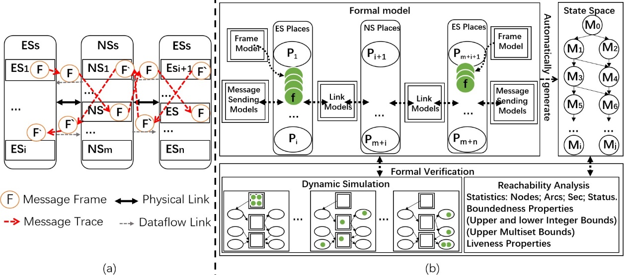 该验证框架使用TCPN对消息在TT网络集群(图1a)的传输行为建模。形式模型(Formal Model)包含三种行为模型,分别是消息帧模型(Frame Model)、消息发送模型(Message Sending Model)和链路模型(Link Model)。验证框架(图1 b)在形式模型上动态仿真(Dynamic Simulaiton)消息传输,直观地检测TT消息传输正确性;模型生成的状态空间(State Space)用于实现可达性分析(Reachability Analysis),例如边界属性、活性属性以及其他用户自定义的时间相关属性。该框架包含基于TCPN的自动建模方法,并且通过状态空间上的关键性属性验证实现了消息传输行为的全局评估,对时间触发网络消息传输问题以及形式化建模、仿真和可达分析方法领域问题的研究具有重要参考价值。