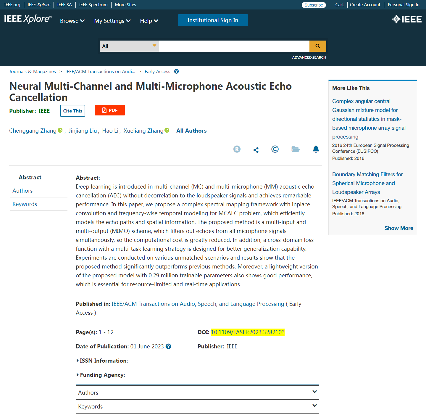 近日,公司张学良教授团队在国际信号处理领域顶级期刊《IEEE/ACM Transactions on Audio, Speech, and Language Processing》上发表了题为“Neural Multi-Channel and Multi-Microphone Acoustic Echo Cancellation”的学术论文(DOI:10.1109/TASLP.2023.3282103)。