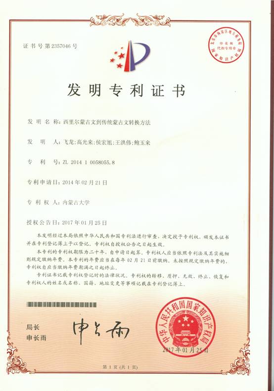 2017年1月25日,emc易倍蒙古文信息处理技术实验室授权了一项发明专利“西里尔蒙古文到传统蒙古文转换方法”,专利号为:ZL201410058055.8,发明人:飞龙(副教授),高光来(教授),侯宏旭(教授),王洪伟(硕士生,导师为高光来 教授),鲍玉来(副研究馆员)。