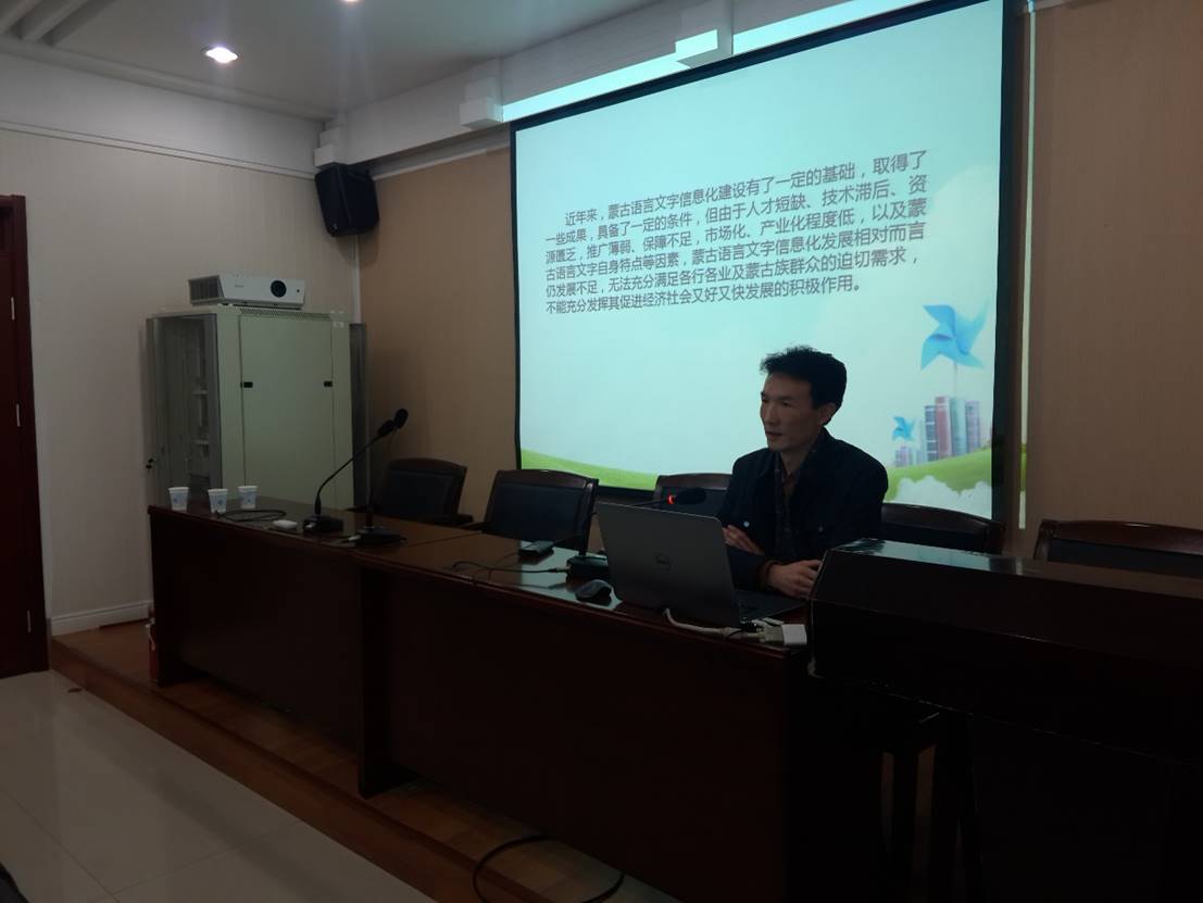 2016年11月23日下午,公司邀请自治区民委蒙古语文信息化处处长阿拉塔做了题目为《蒙古语言文字信息化建设规划与展望》的报告。侯宏旭副经理主持报告会。巩政教授、孟和吉雅副教授、苏向东博士和相关方向的博士生、硕士生参加了报告。