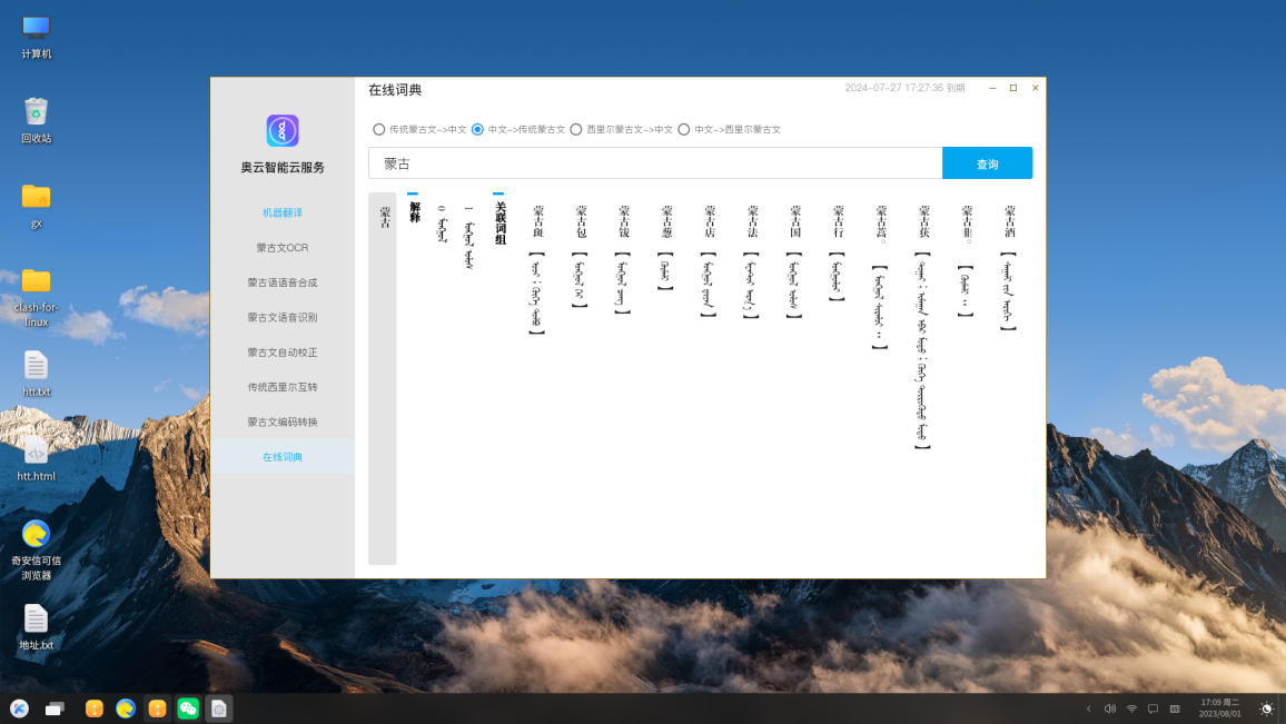 该系统基于自主处理器平台的整机上,采用自主操作系统平台的多语言支撑框架,支持汉、蒙、英三种语言的流畅切换,提供个性化以及稳定高效的产品使用体验。产品同源支持飞腾、鲲鹏、龙芯、兆芯、海光、申威、海思等国产处理器平台以及IntelAMD国际主流处理器,内置多款麒麟自研应用组件提供完善平台支持和流畅交互体验,内嵌奥云智能蒙古文输入法、蒙古文竖排编辑器和蒙古文AI工具箱,让用户更加便捷享受蒙古文智能信息处理服务。