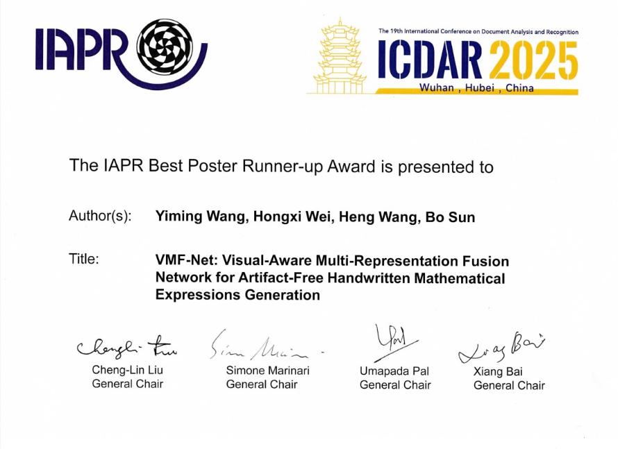ICDAR(International Conference on Document Analysis and Recognition,简称ICDAR)是国际模式识别学会在文档分析与识别领域的旗舰会议。ICDAR 2025于9月16日-21日在武汉召开,本次会议共收到有效投稿论文314篇,最终40篇论文被录用为口头汇报(录用率12.7%),102篇论文被录用为海报展示(录用率32.5%)。公司2023级博士生王一明与其导师魏宏喜教授合作的2篇论文“DCC:Plug-and-Play Dynamic Category Compression for Enhanced Handwritten Text Generation”和“VMF-Net:Visual-Aware Multi-representation Fusion Network for Artifact-Free Handwritten Mathematical Expressions Generation”,分别荣获最佳员工论文亚军奖(Best Student PaperRunner-up Award)和最佳海报亚军奖(Best PosterRunner-up Award)。
