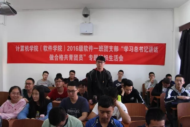 团课上,团支书首先为大家传达了习近平总书记同各界青年代表座谈时的重要讲话内容,并介绍了支部教育实践的具体工作,要求支部全体团员认真学习党的十九大精神,积极参与支部关于“一学一做”的各项专题活动。随后,支部全体团员佩戴团徽,重温宣誓词,并对共青团的发展历程进一步展开了学习讨论。最后,部分支部团员代表积极发言,面向团旗表达了自己的决心与敬意。